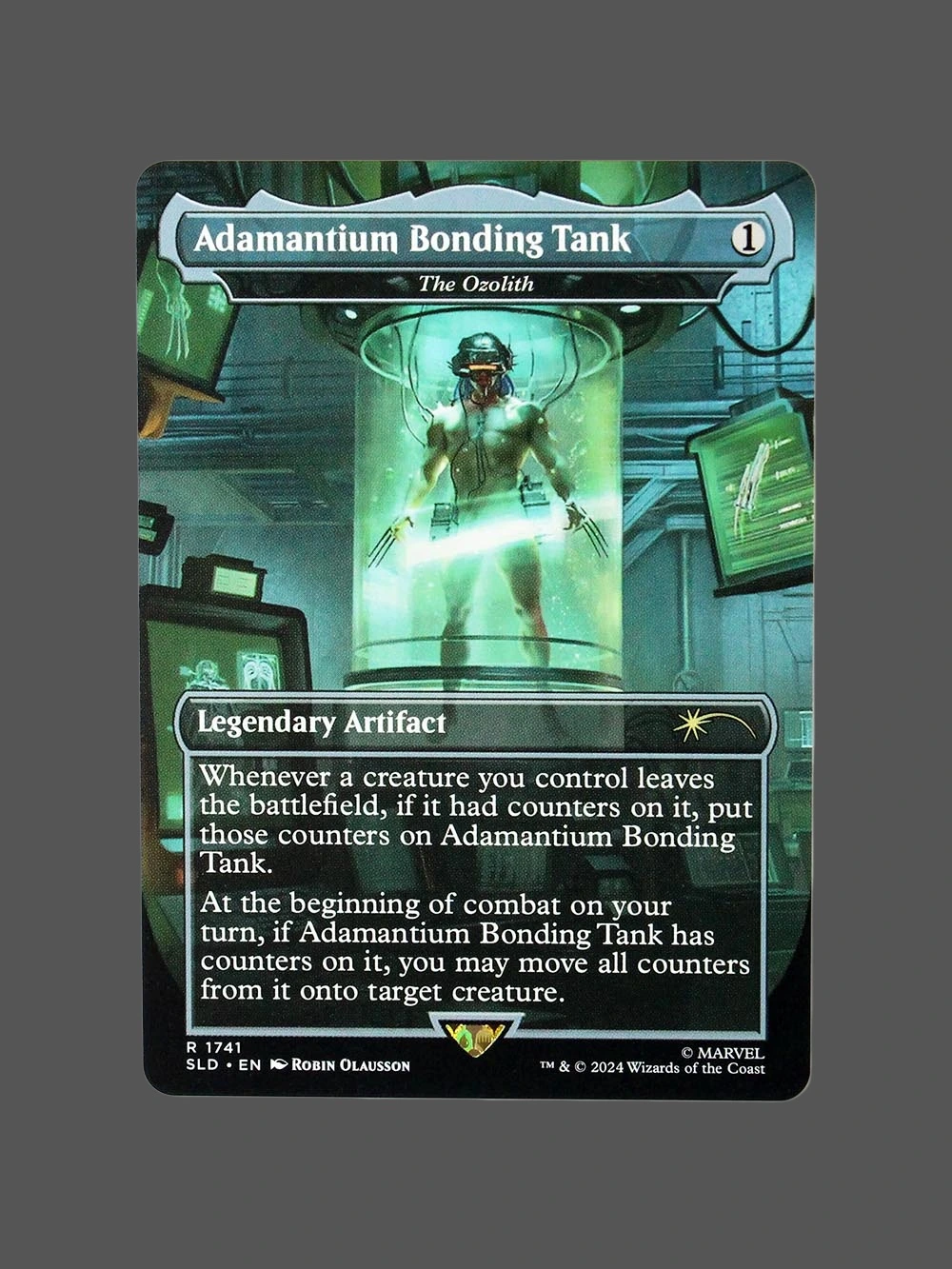 Looking for a high-quality Adamantium Bonding Tank proxy? This Holo proxy from Secret Lair Drop Series (SLD) is a Legendary Artifact that captures the essence of Marvel’s iconic technology. Whenever a creature you control leaves the battlefield with counters, they transfer to this tank, and at the start of combat, you can move those counters to any target creature. Built with German black core paper and professional CMYK printing, it’s virtually indistinguishable from the original.