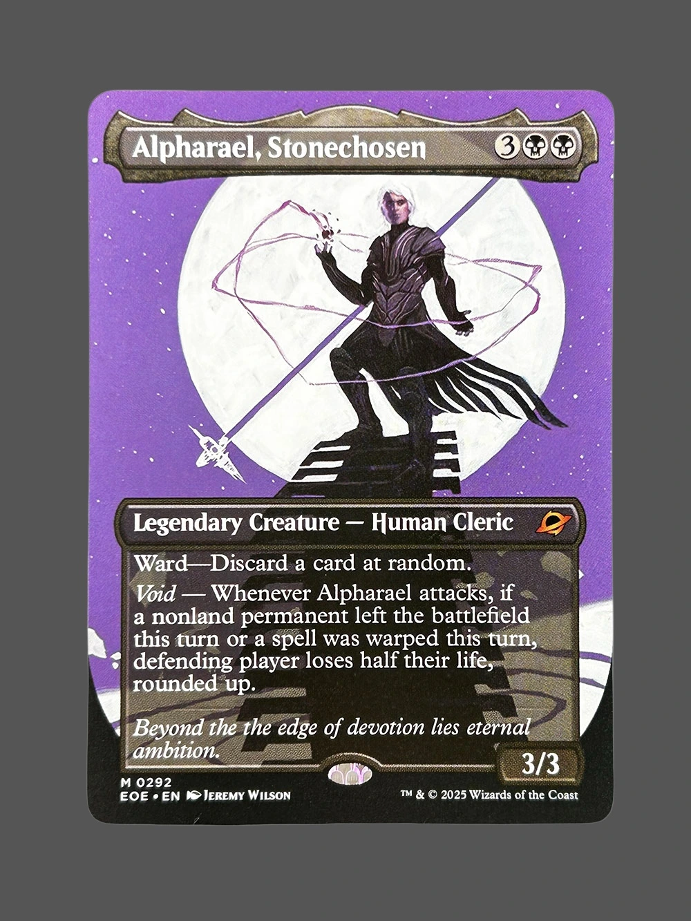 Looking for a high-quality Alpharael, Stonechosen proxy? This Holo proxy from The Brothers’ War (EOE) is a Legendary Creature — Human Cleric that combines Ward and Void abilities to disrupt opponents and deal devastating life damage. Built with German black core paper and professional CMYK printing, it’s virtually indistinguishable from the original.