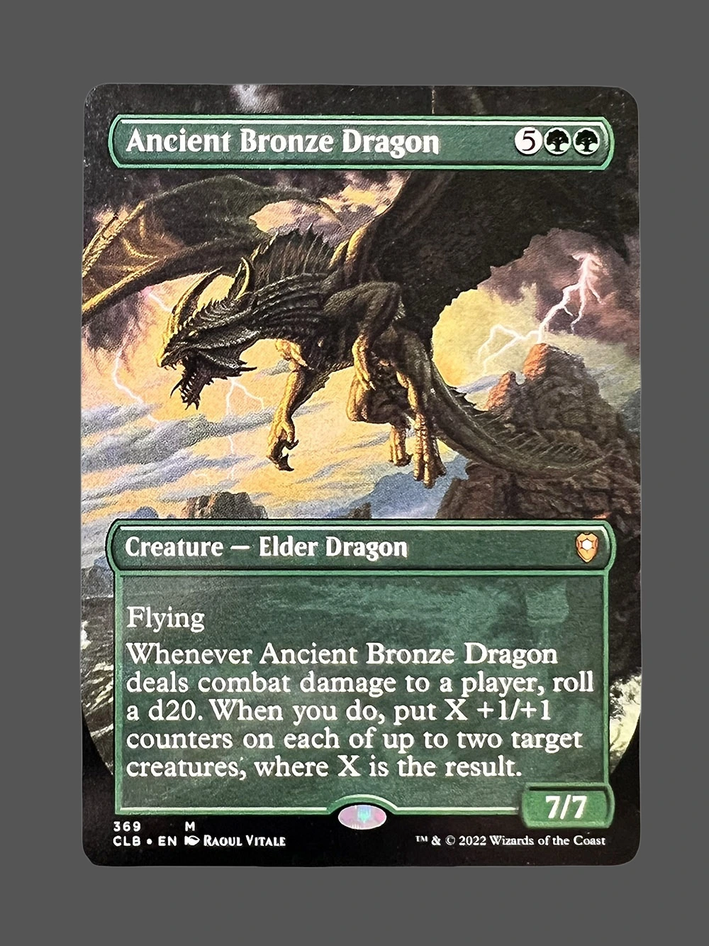 Looking for a high-quality Ancient Bronze Dragon proxy? This Holo proxy from Commander Legends: Battle for Baldur’s Gate (CLB) is a Creature — Elder Dragon that gains +1/+1 counters on creatures when it deals combat damage, making it a powerful finisher in green decks. Built with German black core paper and professional CMYK printing, it’s virtually indistinguishable from the original.