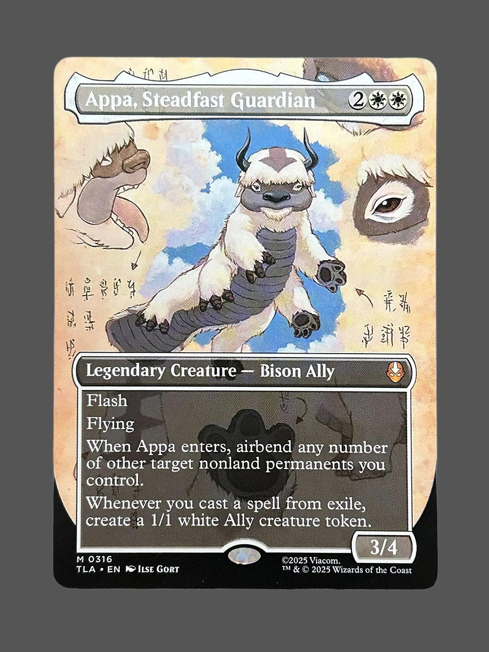 Looking for a high-quality Appa, Steadfast Guardian proxy? This Holo proxy from The Lost Age (TLA) is a Legendary Creature — Bison Ally with Flash and Flying. When Appa enters the battlefield, you can airbend any number of other target nonland permanents you control. Whenever you cast a spell from exile, create a 1/1 white Ally creature token. Built with German black core paper and professional CMYK printing, it’s virtually indistinguishable from the original.