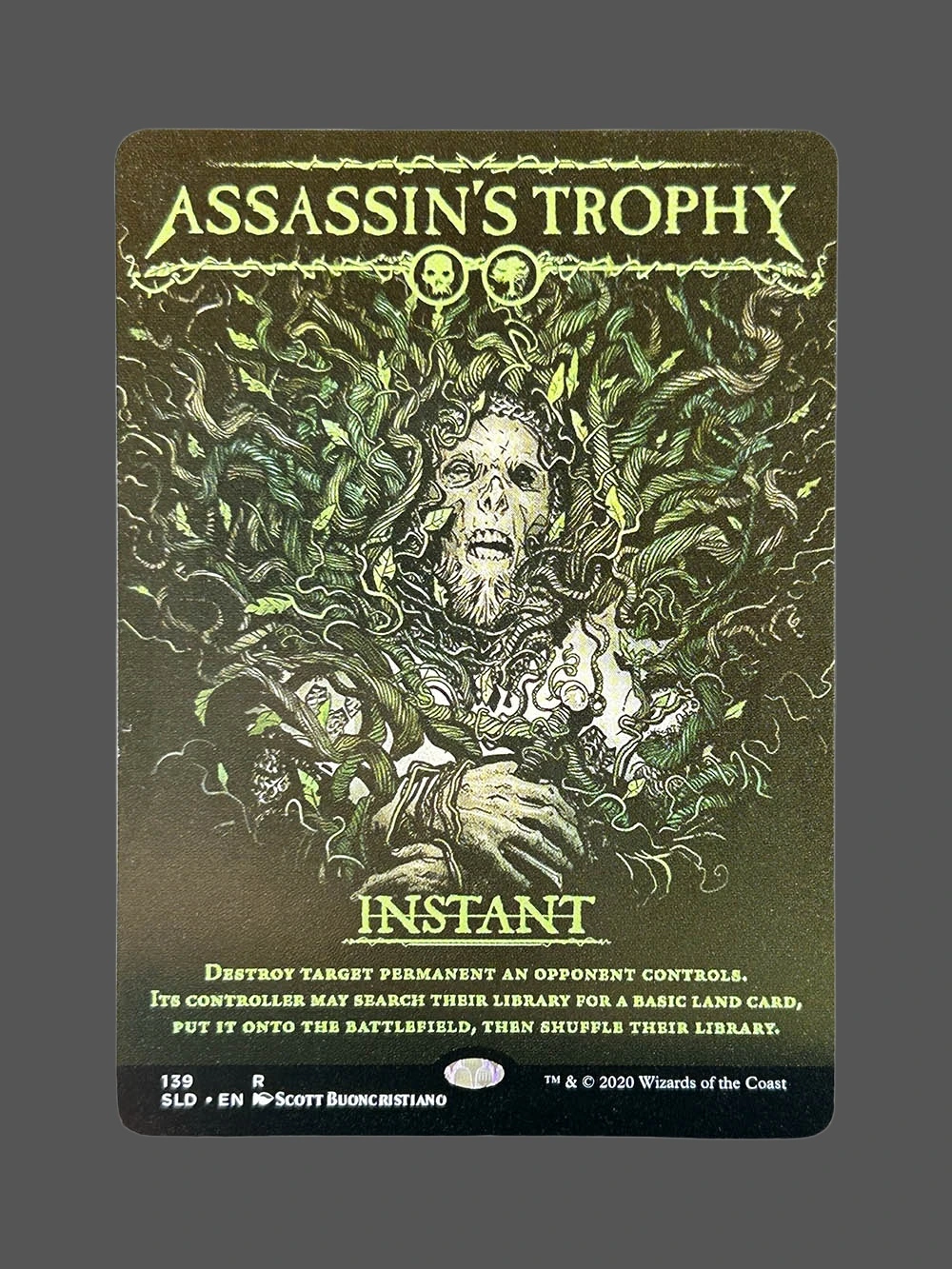 Looking for a high-quality Assassin’s Trophy proxy? This Holo version from Streets of New Capenna (SLD) is an Instant that destroys a target permanent an opponent controls, allowing its controller to search their library for a basic land card, put it onto the battlefield, then shuffle their library. Built with German black core paper and professional CMYK printing, it’s virtually indistinguishable from the original.