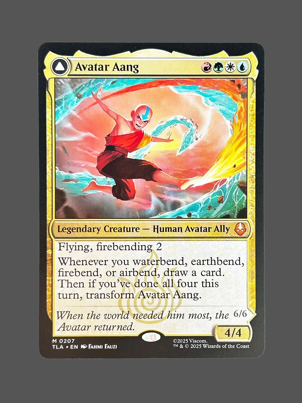 Looking for a high-quality Avatar Aang proxy? This Holo proxy from The Lost Caverns of Ixalan (TLA) is a Legendary Creature — Human Avatar Ally that grants flying and firebending 2, drawing a card whenever you use any bending type. If you complete all four bends in a turn, it transforms into its powerful alternate form. Built with German black core paper and professional CMYK printing, it’s virtually indistinguishable from the original.