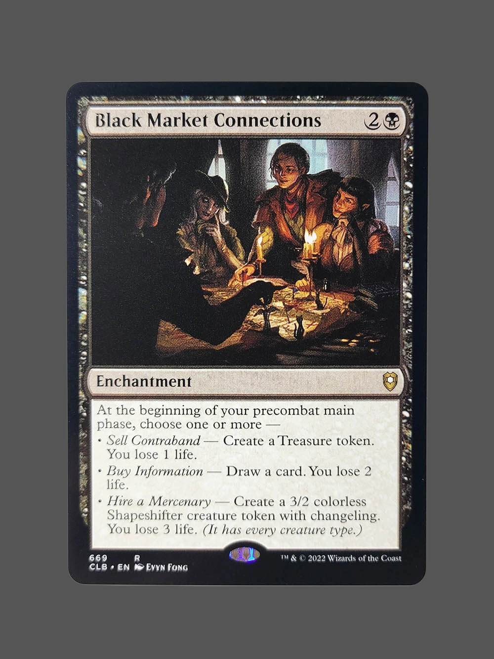 Buy Black Market Connections Holo MTG proxy from Crimson Vow. Premium cardstock, professional CMYK printing. Perfect for deck testing.