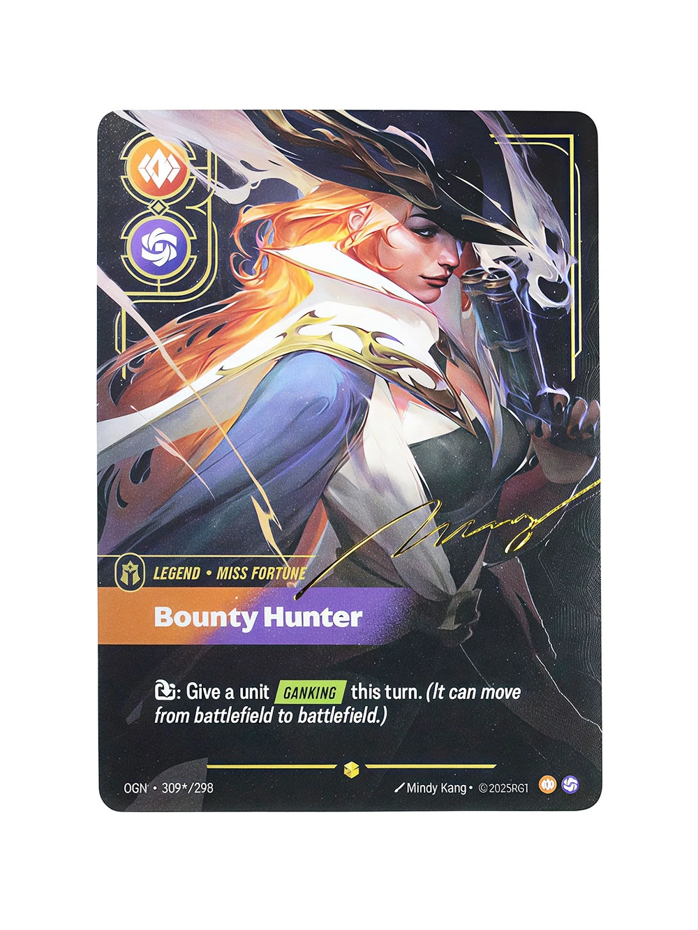 Buy Bounty Hunter Signature Foil Riftbound proxy from Origins. Premium cardstock, professional printing, artist signature foil. Perfect for deck testing.