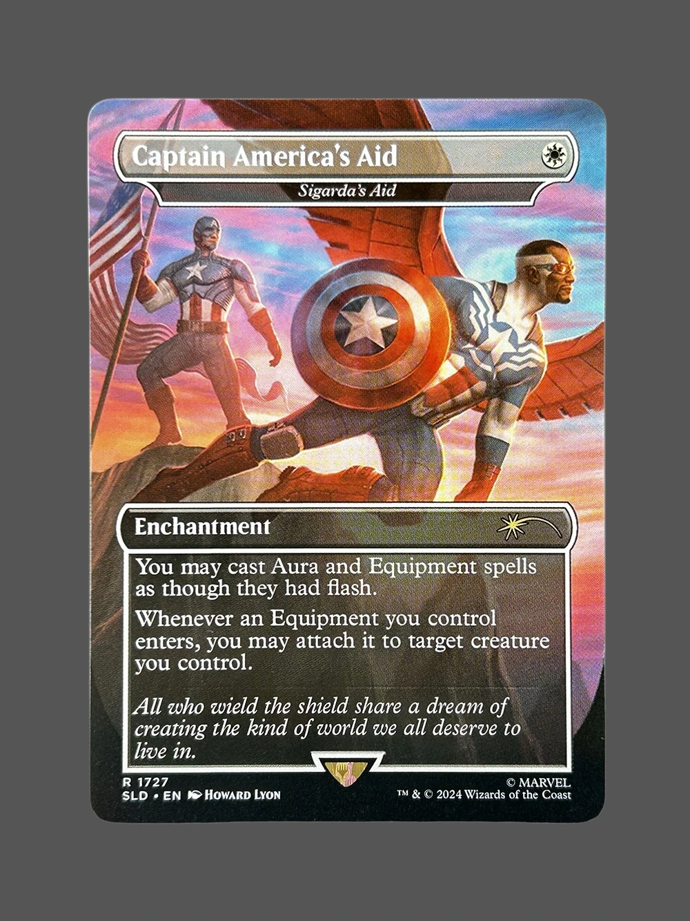 Looking for a high-quality Captain America’s Aid proxy? This Holo proxy from Secret Lairs (SLD) is an Enchantment that allows you to cast Aura and Equipment spells as though they had flash, and attach Equipment to creatures when it enters the battlefield. Built with German black core paper and professional CMYK printing, it’s virtually indistinguishable from the original.