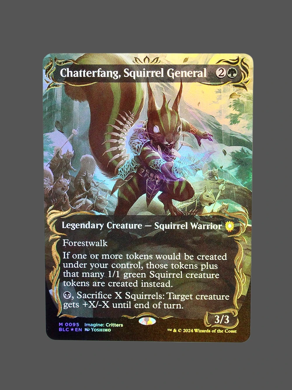 Looking for a high-quality Chatterfang, Squirrel General proxy? This Raised Foil proxy from The Brothers’ War (BLC) is a Legendary Creature — Squirrel Warrior that boosts your token generation with squirrel tokens and offers a powerful sacrifice ability. Built with German black core paper and professional CMYK printing, it’s virtually indistinguishable from the original.