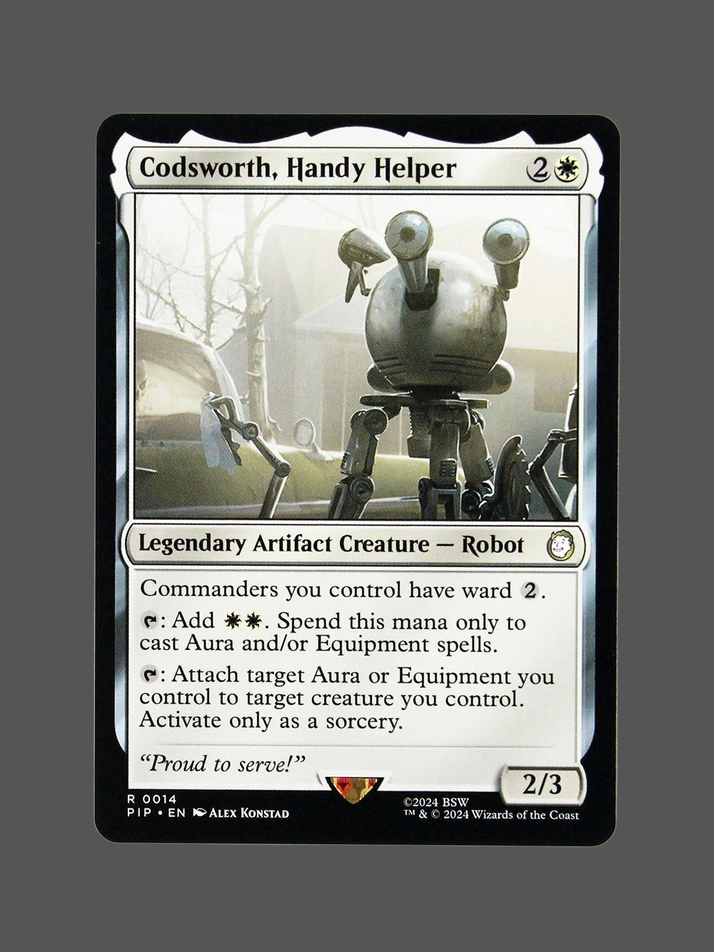 Looking for a high-quality Codsworth, Handy Helper proxy? This Holo proxy from Phyrexia: All Will Be One (PIP) is a Legendary Artifact Creature — Robot that grants ward 2 to your commanders and provides versatile mana and equipment attachment abilities. Built with German black core paper and professional CMYK printing, it’s virtually indistinguishable from the original.