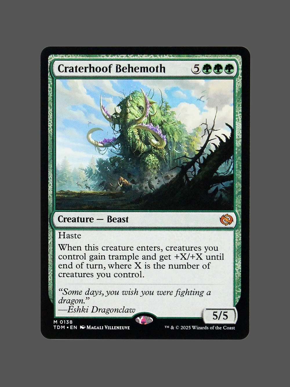 Looking for a high-quality Craterhoof Behemoth proxy? This Holo proxy from The Lost Caverns of Ixalan (TDM) is a Creature — Beast that grants all your creatures trample and +X/+X when it enters the battlefield, where X equals the number of creatures you control. Built with German black core paper and professional CMYK printing, it’s virtually indistinguishable from the original.