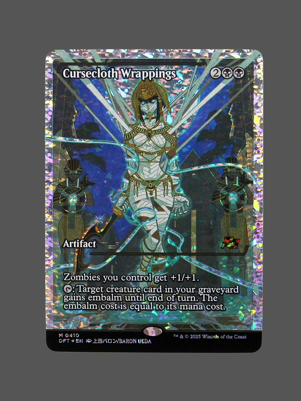 Looking for a high-quality Cursecloth Wrappings proxy? This Fracture Foil version from Dominaria United (DFT) is an Artifact that boosts your Zombies by +1/+1 and lets you embalm creature cards from your graveyard. Built with German black core paper and professional CMYK printing, it’s virtually indistinguishable from the original.