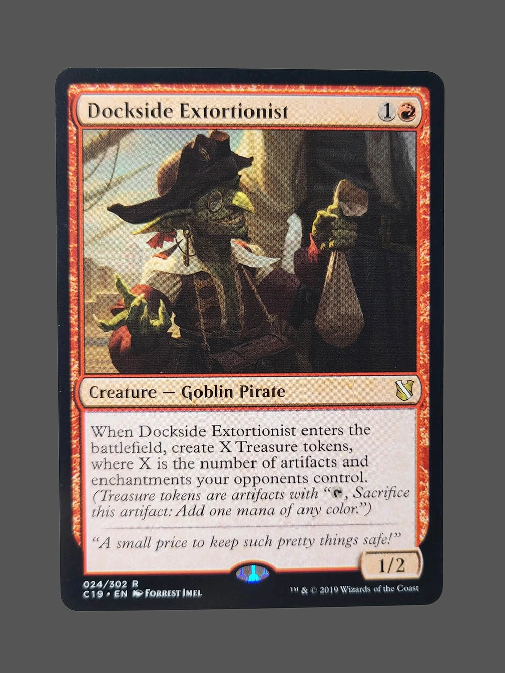 Looking for a high-quality Dockside Extortionist proxy? This Holo proxy from Core Set 2019 (C19) is a Creature — Goblin Pirate that creates Treasure tokens equal to the number of artifacts and enchantments your opponents control when it enters the battlefield. Built with German black core paper and professional CMYK printing, it’s virtually indistinguishable from the original.