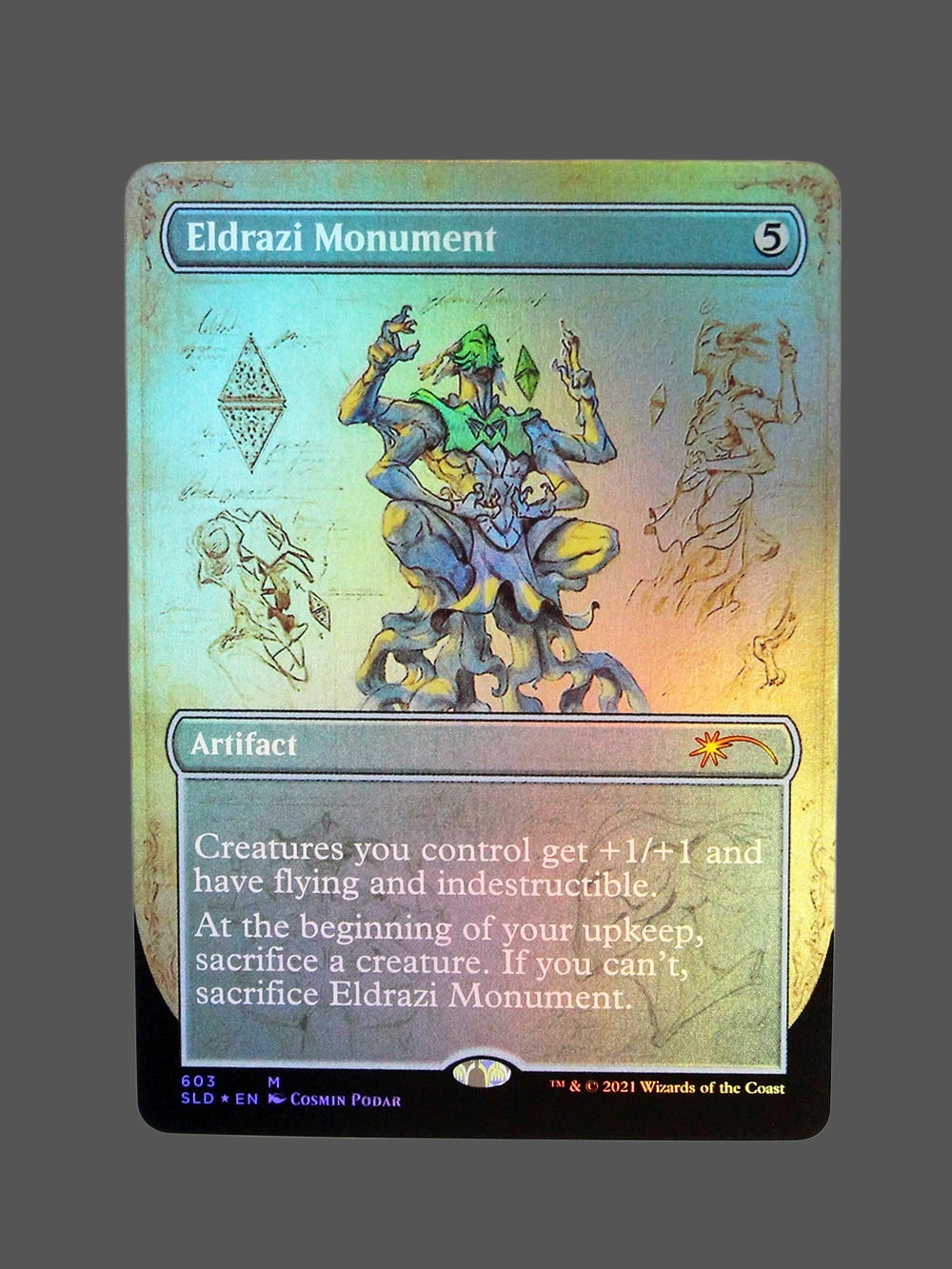 Looking for a high-quality Eldrazi Monument proxy? This Foil proxy from Secrets of the Sphinx (SLD) is an Artifact that grants your creatures +1/+1, flying, and indestructible — but at a cost: you must sacrifice a creature each turn or lose the monument. Built with German black core paper and professional CMYK printing, it’s virtually indistinguishable from the original.