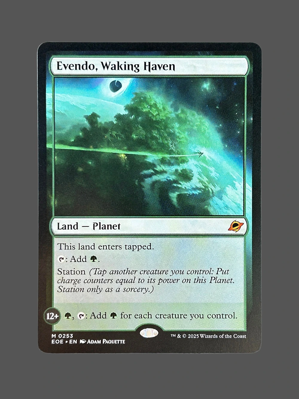 Looking for a high-quality Evendo, Waking Haven proxy? This Holo proxy from Eldritch Evolutions (EOE) is a Land — Planet that enters tapped and produces green mana. It also has the Station ability, allowing you to tap a creature to add charge counters equal to its power. Built with German black core paper and professional CMYK printing, it’s virtually indistinguishable from the original.