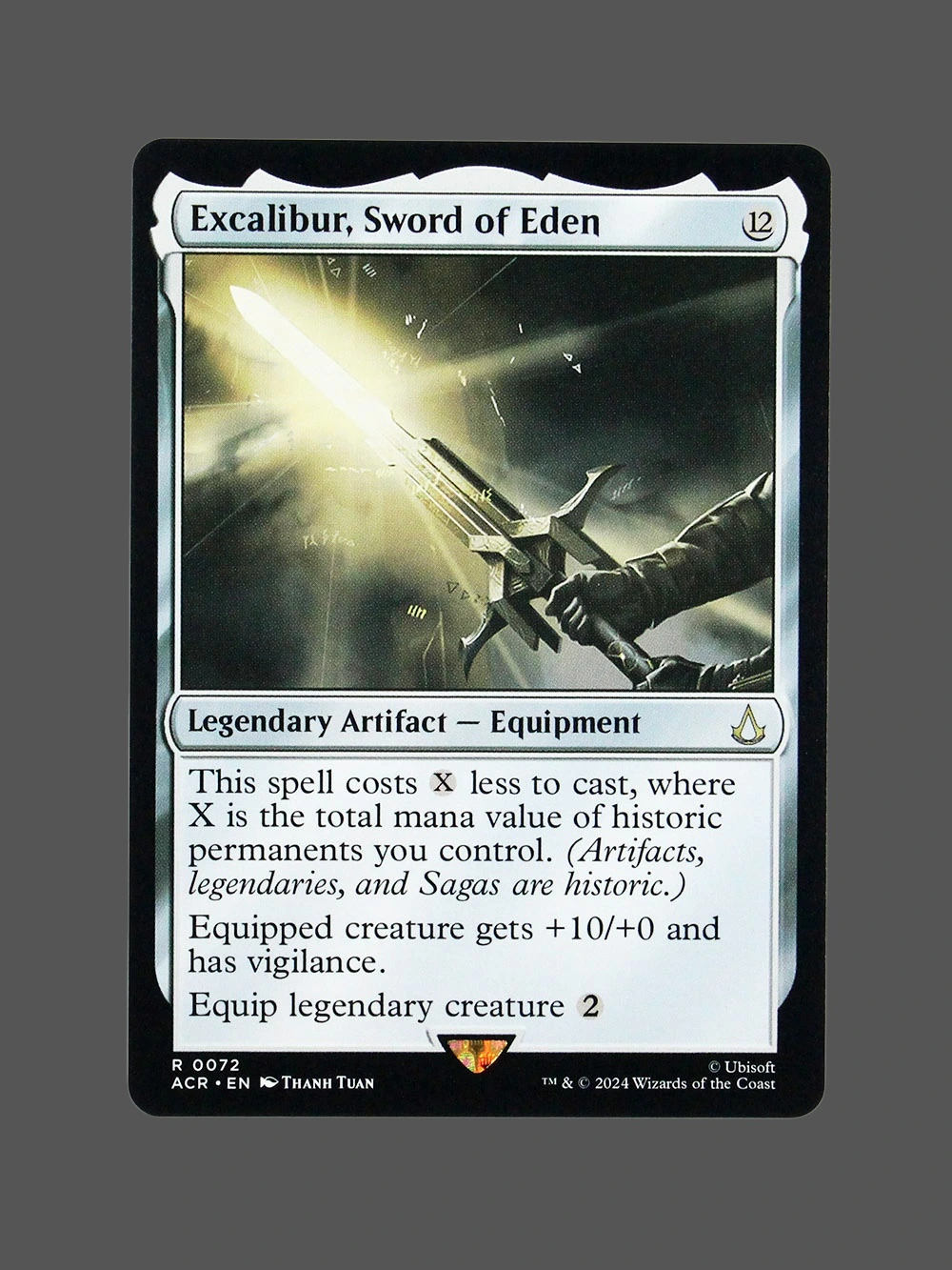 Looking for a high-quality Excalibur, Sword of Eden proxy? This Holo proxy from Aether Revolt (ACR) is a Legendary Artifact — Equipment that reduces its casting cost based on the total mana value of historic permanents you control. It grants equipped legendary creature +10/+0 and vigilance, making it a powerful tool in historic decks. Built with German black core paper and professional CMYK printing, it’s virtually indistinguishable from the original.