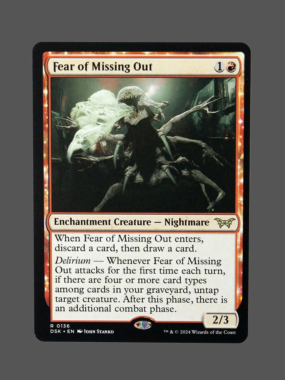 Looking for a high-quality Fear of Missing Out proxy? This Holo proxy from Dominaria Skies (DSK) is an Enchantment Creature — Nightmare that enters the battlefield with a discard-and-draw effect and grants an additional combat phase under Delirium. Built with German black core paper and professional CMYK printing, it’s virtually indistinguishable from the original.