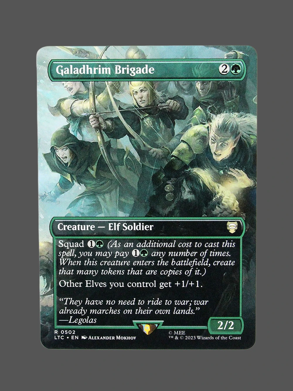 Looking for a high-quality Galadhrim Brigade proxy? This Holo proxy from Lord of the Rings: Tales of Middle-earth (LTC) is a Creature — Elf Soldier that creates token copies of itself when cast and boosts other Elves you control. Built with German black core paper and professional CMYK printing, it’s virtually indistinguishable from the original.