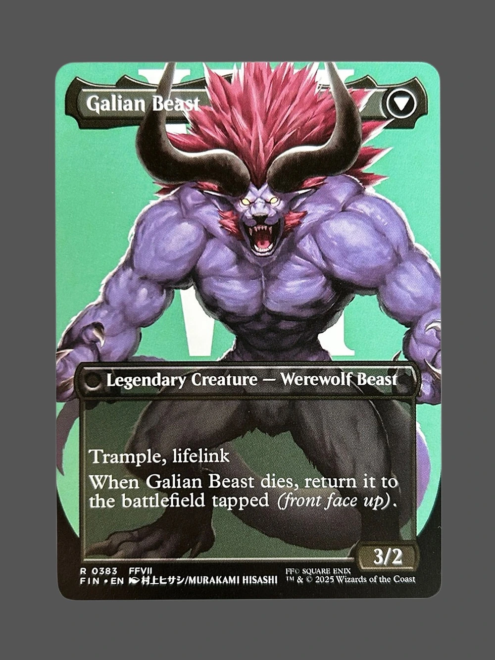 Looking for a high-quality Galian Beast proxy? This Holo proxy from Final Fantasy (FFVII) is a Legendary Creature — Werewolf Beast that enters the battlefield with trample and lifelink, and returns to play when it dies. Built with German black core paper and professional CMYK printing, it’s virtually indistinguishable from the original.