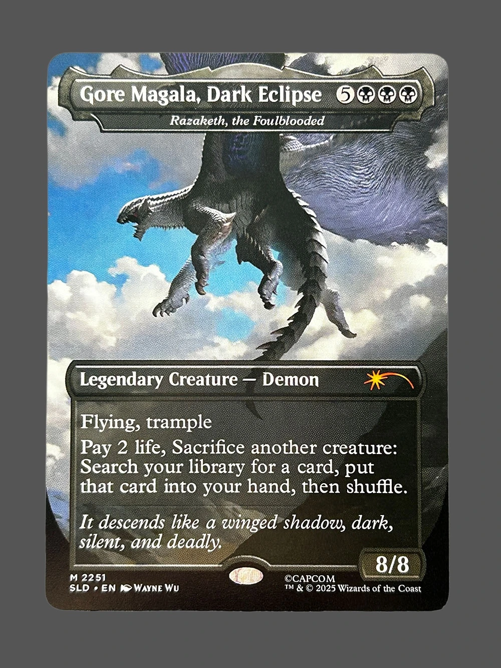 Looking for a high-quality Gore Magala, Dark Eclipse proxy? This Holo proxy from Streets of New Capenna (SLD) is a Legendary Creature — Demon with flying and trample abilities. Pay 2 life and sacrifice another creature to search your library for any card and add it to your hand. Built with German black core paper and professional CMYK printing, it’s virtually indistinguishable from the original.