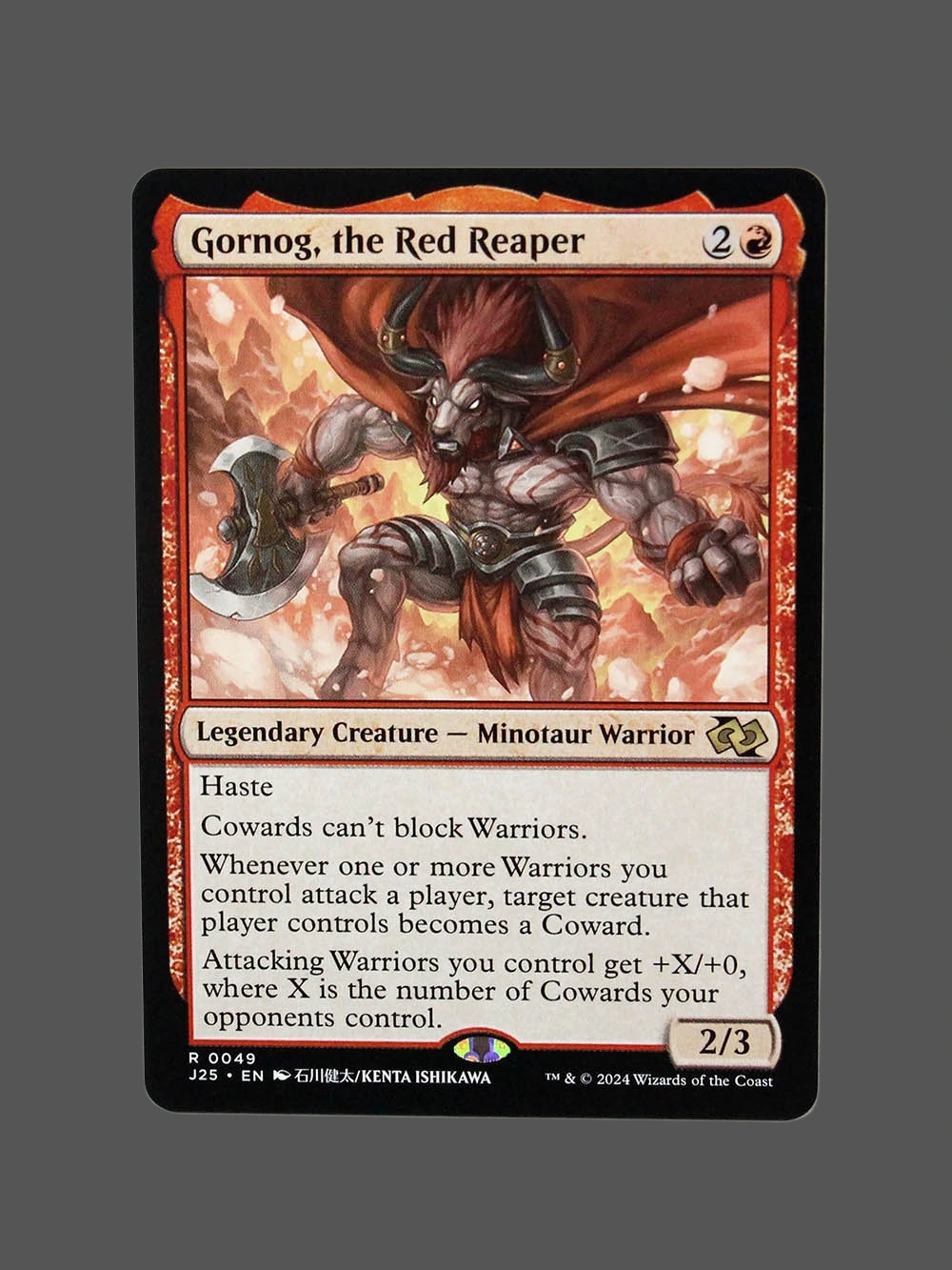 Looking for a high-quality Gornog, the Red Reaper proxy? This Holo proxy from Jumpstart 2025 (J25) is a Legendary Creature — Minotaur Warrior that grants haste and turns enemy creatures into Cowards when your Warriors attack. Built with German black core paper and professional CMYK printing, it’s virtually indistinguishable from the original.