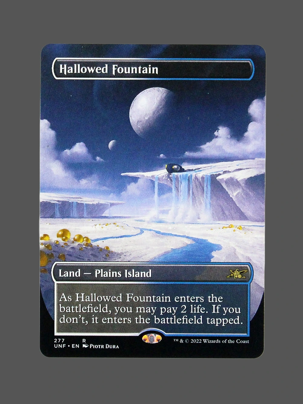 Looking for a high-quality Hallowed Fountain proxy? This Holo proxy from Unfinity (UNF) is a Land — Plains Island that provides flexible mana options and enters the battlefield untapped if you pay 2 life. Built with German black core paper and professional CMYK printing, it’s virtually indistinguishable from the original.