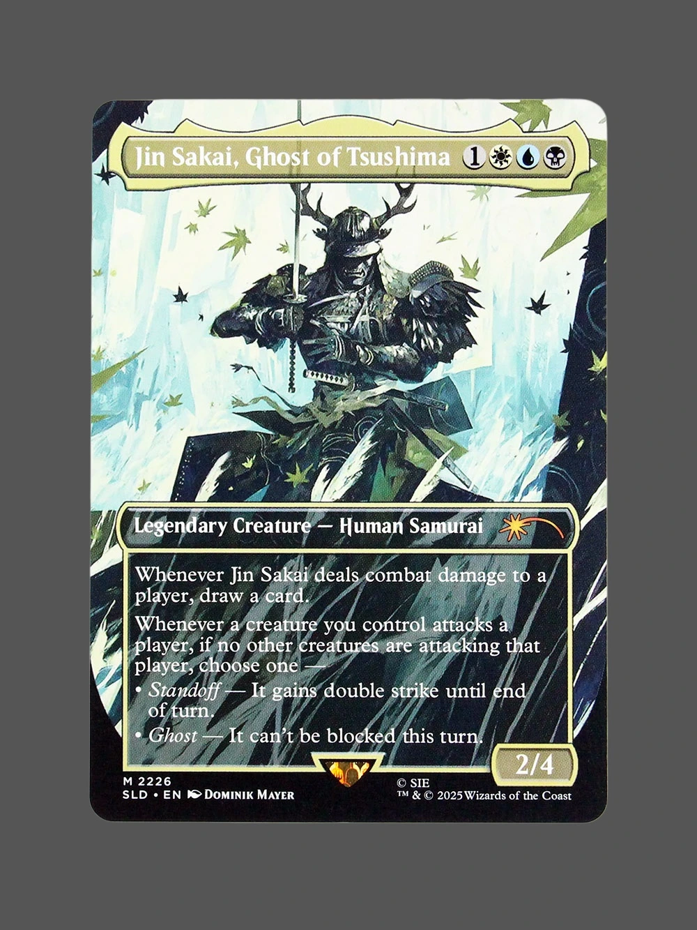 Buy Jin Sakai, Ghost of Tsushima Holo MTG proxy from Secret Lair. Premium cardstock, professional CMYK printing. Perfect for deck testing.