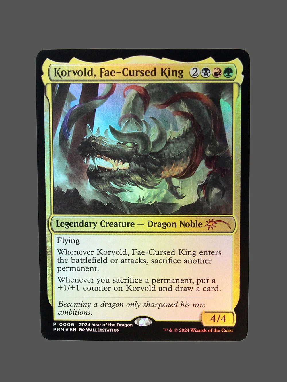 Buy Korvold, Fae-Cursed King Foil MTG proxy from Year of the Dragon. Premium cardstock, professional CMYK printing. Perfect for deck testing.