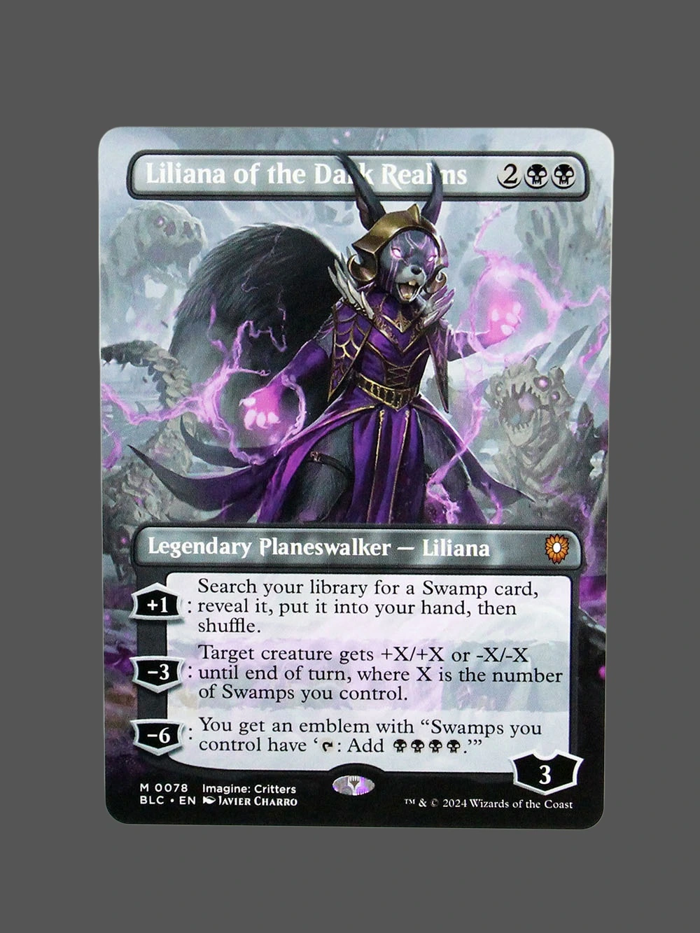 Looking for a high-quality Liliana of the Dark Realms proxy? This Holo proxy from The Brothers’ War (BLC) is a Legendary Planeswalker that lets you search your library for a Swamp card, boost creatures based on your Swamps, and create an emblem that adds black mana. Built with German black core paper and professional CMYK printing, it’s virtually indistinguishable from the original.