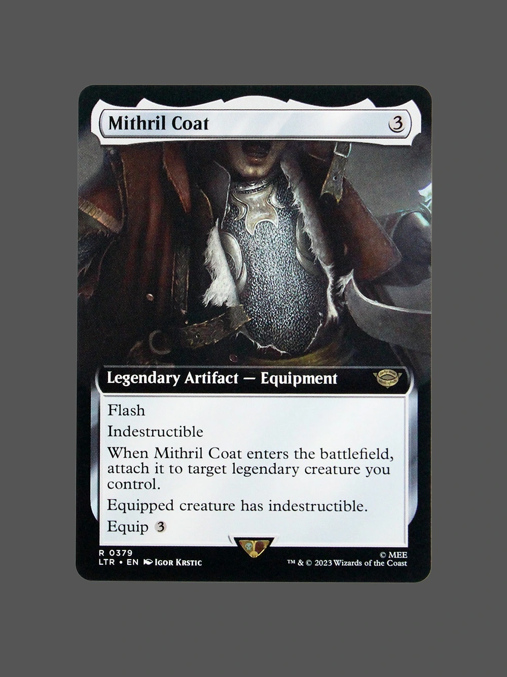Looking for a high-quality Mithril Coat proxy? This Holo proxy from Lord of the Rings (LTR) is a Legendary Artifact — Equipment that grants indestructible to a legendary creature you control. With Flash and Indestructible abilities, it’s a powerful tool in artifact-focused decks. Built with German black core paper and professional CMYK printing, it’s virtually indistinguishable from the original.