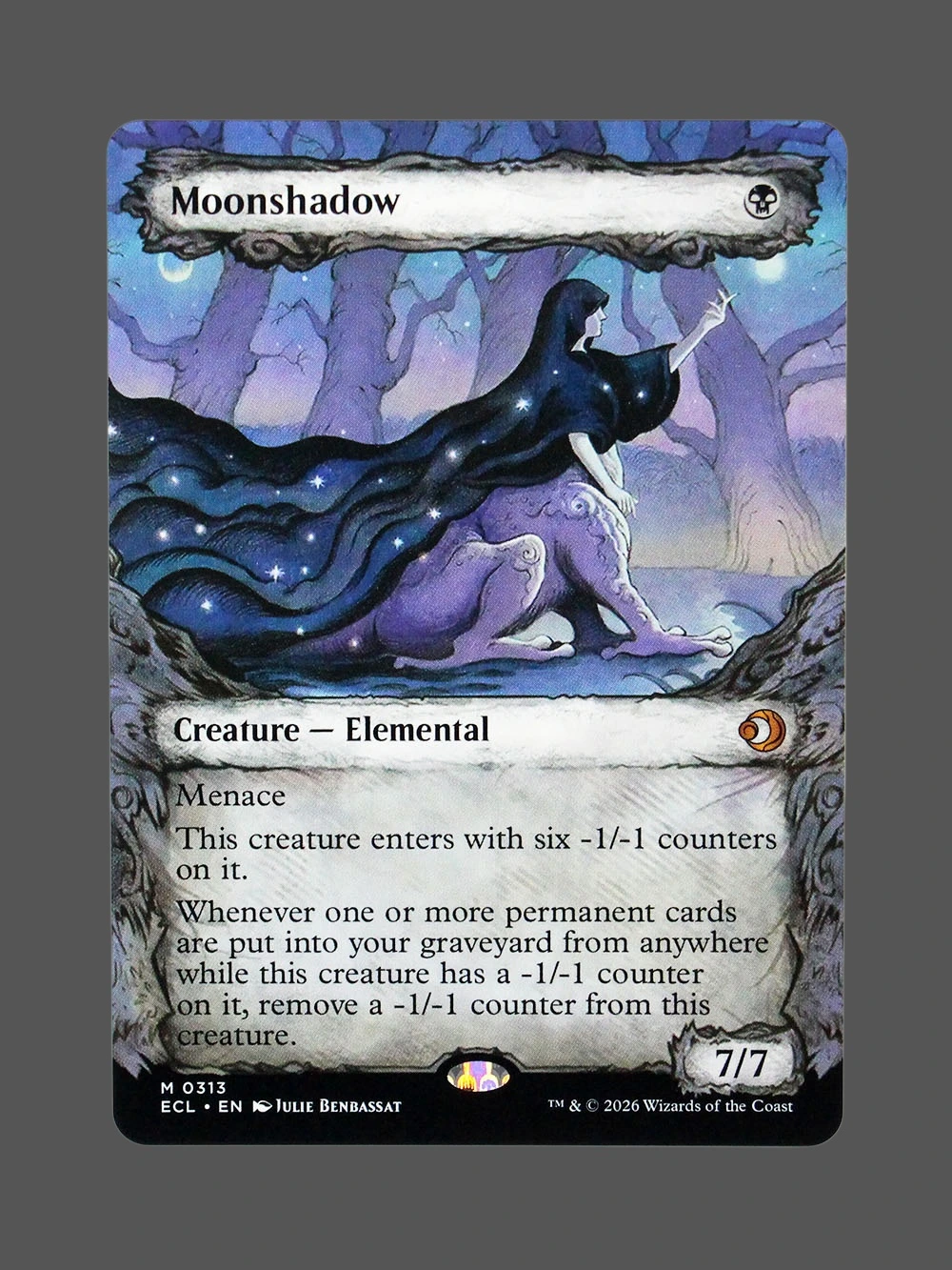 Looking for a high-quality Moonshadow proxy? This Holo proxy from Eldritch Moon (ECL) is a Creature — Elemental with Menace that enters the battlefield with six -1/-1 counters and removes one when permanents are put into your graveyard. Built with German black core paper and professional CMYK printing, it’s virtually indistinguishable from the original.