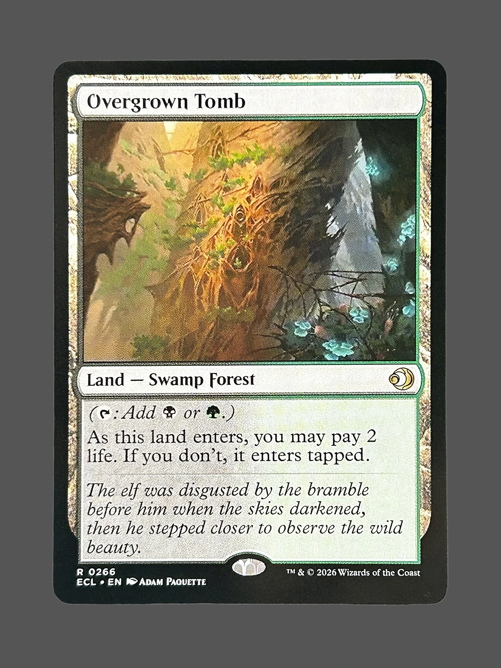 Looking for a high-quality Overgrown Tomb proxy? This Holo proxy from Eldritch Moon (ECL) is a Land — Swamp Forest that adds black or green mana when tapped. It features a unique enters-the-battlefield effect: you may pay 2 life to have it enter untapped, otherwise it enters tapped. Built with German black core paper and professional CMYK printing, it’s virtually indistinguishable from the original.