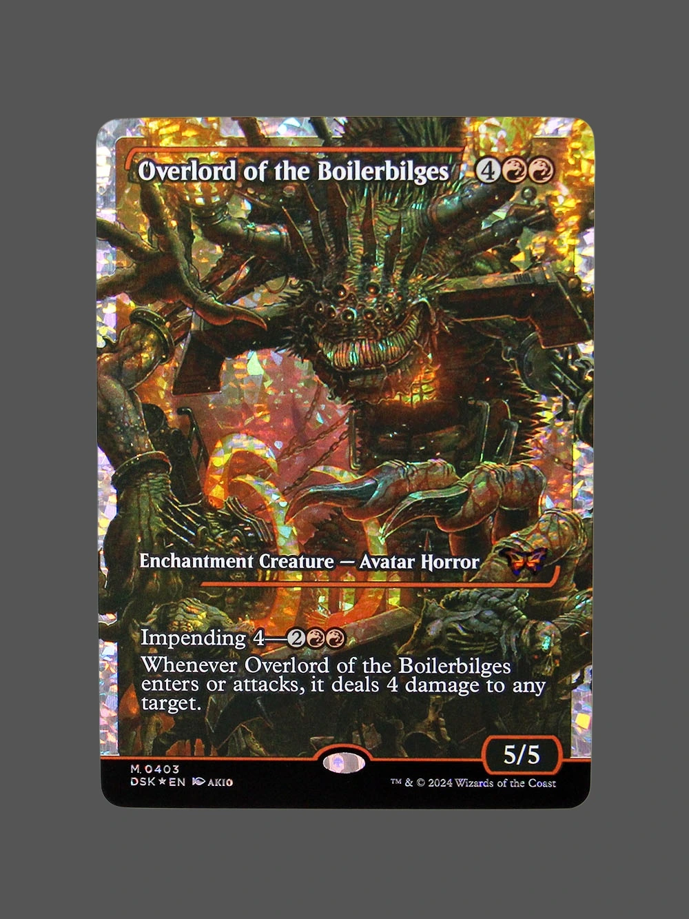 Tags: avatar-horror, dsk, duskmourn, enchantment-creature, fracture foil, fracture-Fracture Foil, mtg-proxy, multicolor, overlord-of-the-boilerbilges