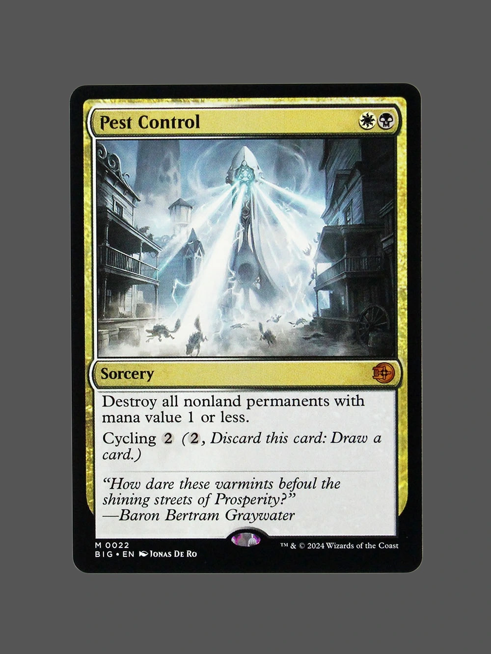 Looking for a high-quality Pest Control proxy? This Holo proxy from Big Game Hunters (BIG) is a Sorcery that destroys all nonland permanents with mana value 1 or less, making it a powerful board wipe in aggressive decks. Built with German black core paper and professional CMYK printing, it’s virtually indistinguishable from the original.