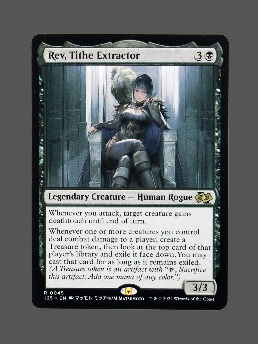 Looking for a high-quality Rev, Tithe Extractor proxy? This Holo proxy from Jumpstart 2024 (J25) is a Legendary Creature — Human Rogue that grants deathtouch to your attacking creatures and creates Treasure tokens when dealing combat damage. With its powerful ability to exile and cast cards from an opponent’s library, it’s a key card in many aggressive decks. Built with German black core paper and professional CMYK printing, it’s virtually indistinguishable from the original.