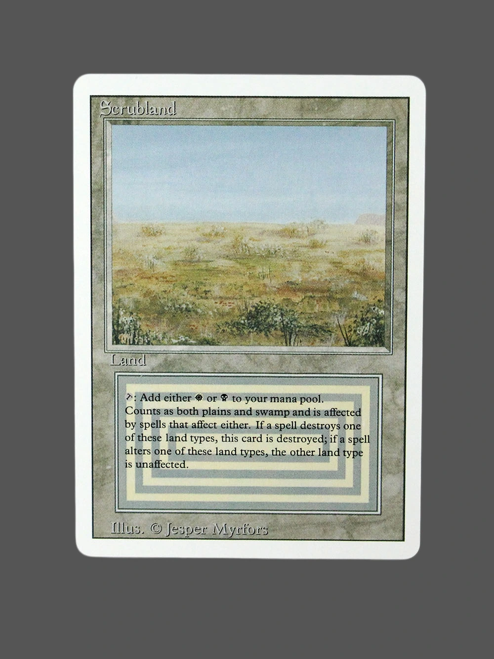 Looking for a high-quality Scrubland proxy? This Holo proxy from Third Edition (3ED) is a Land that adds either white or black mana to your pool and counts as both plains and swamp. Built with German black core paper and professional CMYK printing, it’s virtually indistinguishable from the original.