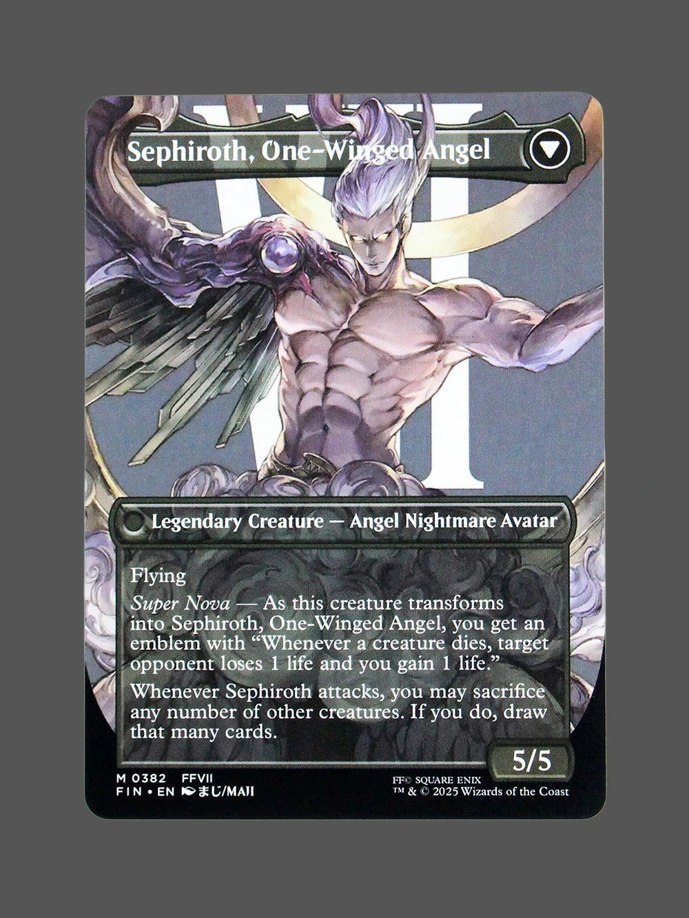 Looking for a high-quality Sephiroth, One-Winged Angel proxy? This Holo proxy from Final Fantasy VII (FFVII) is a Legendary Creature — Angel Nightmare Avatar that transforms into a powerful flying threat with Super Nova ability. When it transforms, you gain an emblem that triggers life loss and gain when creatures die. During attacks, sacrifice creatures to draw cards equal to the number sacrificed. Built with German black core paper and professional CMYK printing, it’s virtually indistinguishable from the original.