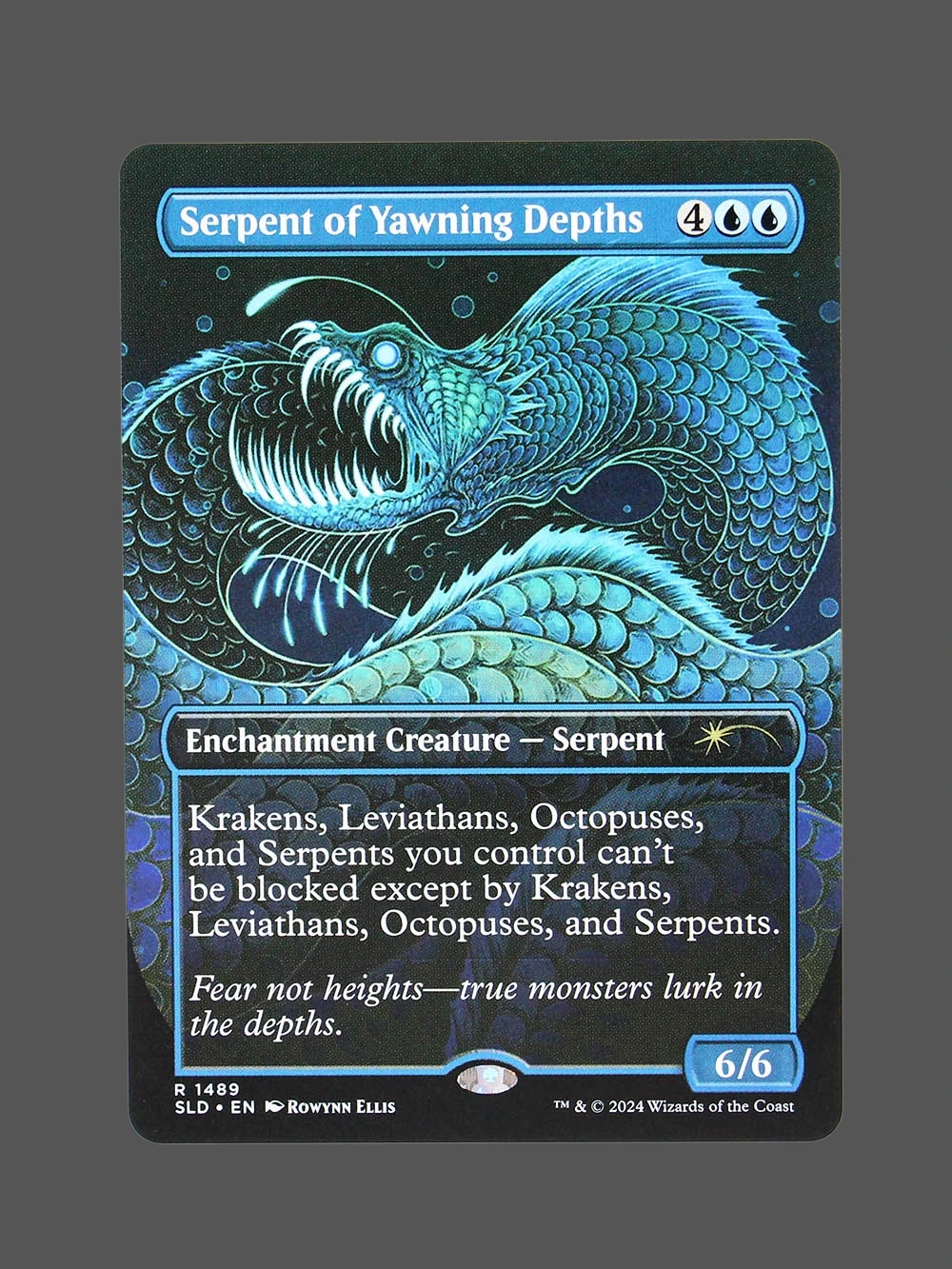 Looking for a high-quality Serpent of Yawning Depths proxy? This Holo proxy from Secret Lair Drop Series (SLD) is an Enchantment Creature — Serpent with powerful abilities that make your Krakens, Leviathans, Octopuses, and Serpents unblockable except by similar creatures. Built with German black core paper and professional CMYK printing, it’s virtually indistinguishable from the original.