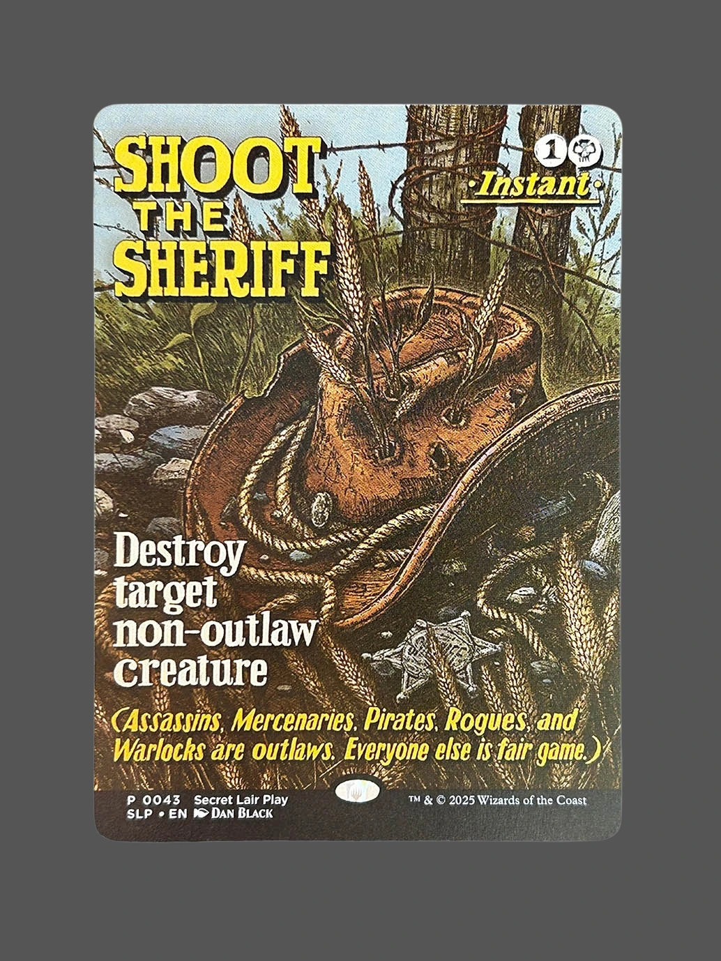 Buy Shoot the Sheriff Holo MTG proxy from Secret Lair Play. Premium cardstock, professional CMYK printing. Perfect for deck testing.