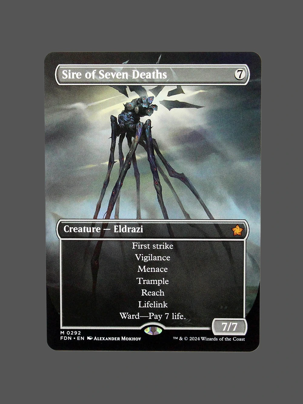 Looking for a high-quality Sire of Seven Deaths proxy? This Holo proxy from Foundations (FDN) is a Creature — Eldrazi with First strike, Vigilance, Menace, Trample, Reach, Lifelink, and Ward—Pay 7 life. A powerful finisher in many Eldrazi decks, this card offers massive stats and disruptive abilities. Built with German black core paper and professional CMYK printing, it’s virtually indistinguishable from the original.