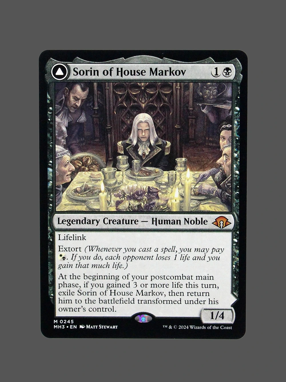 Looking for a high-quality Sorin of House Markov proxy? This Holo proxy from Magic: The Gathering (MH3) is a Legendary Creature — Human Noble with Lifelink and Extort abilities. It allows you to gain life while forcing opponents to lose life when casting spells, and can transform at the end of your turn if you gained enough life. Built with German black core paper and professional CMYK printing, it’s virtually indistinguishable from the original.