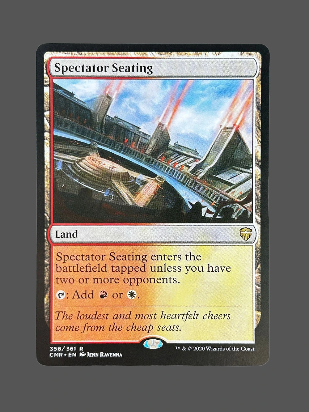 Looking for a high-quality Spectator Seating proxy? This Holo proxy from Commander Legends (CMR) is a Land that enters the battlefield tapped unless you have two or more opponents, and taps to add one mana of any color. Built with German black core paper and professional CMYK printing, it’s virtually indistinguishable from the original.