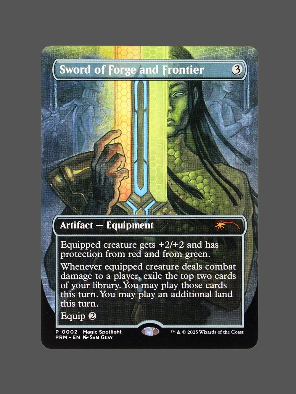 Looking for a high-quality Sword of Forge and Frontier proxy? This Holo proxy from Magic Spotlight (PRM) is an Artifact — Equipment that grants equipped creatures +2/+2 and protection from red and green. When the equipped creature deals combat damage to a player, you exile the top two cards of your library and may play them this turn, plus an additional land. Built with German black core paper and professional CMYK printing, it’s virtually indistinguishable from the original.