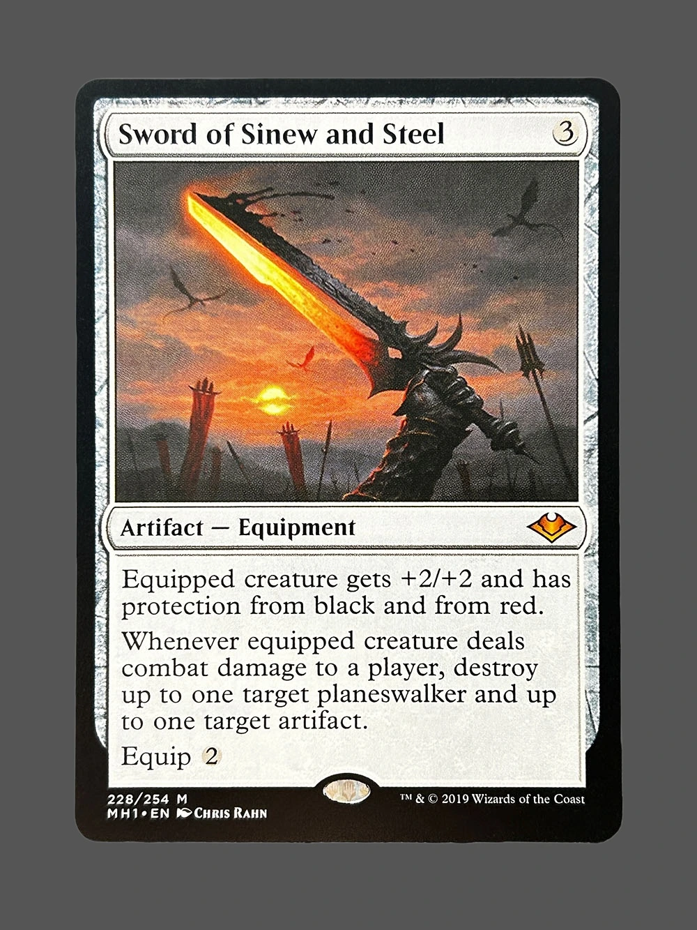 Looking for a high-quality Sword of Sinew and Steel proxy? This Holo proxy from Magic 2019 (MH1) is an Artifact — Equipment that grants equipped creatures +2/+2 and protection from black and red. When the equipped creature deals combat damage to a player, it destroys up to one target planeswalker and one artifact. Built with German black core paper and professional CMYK printing, it’s virtually indistinguishable from the original.