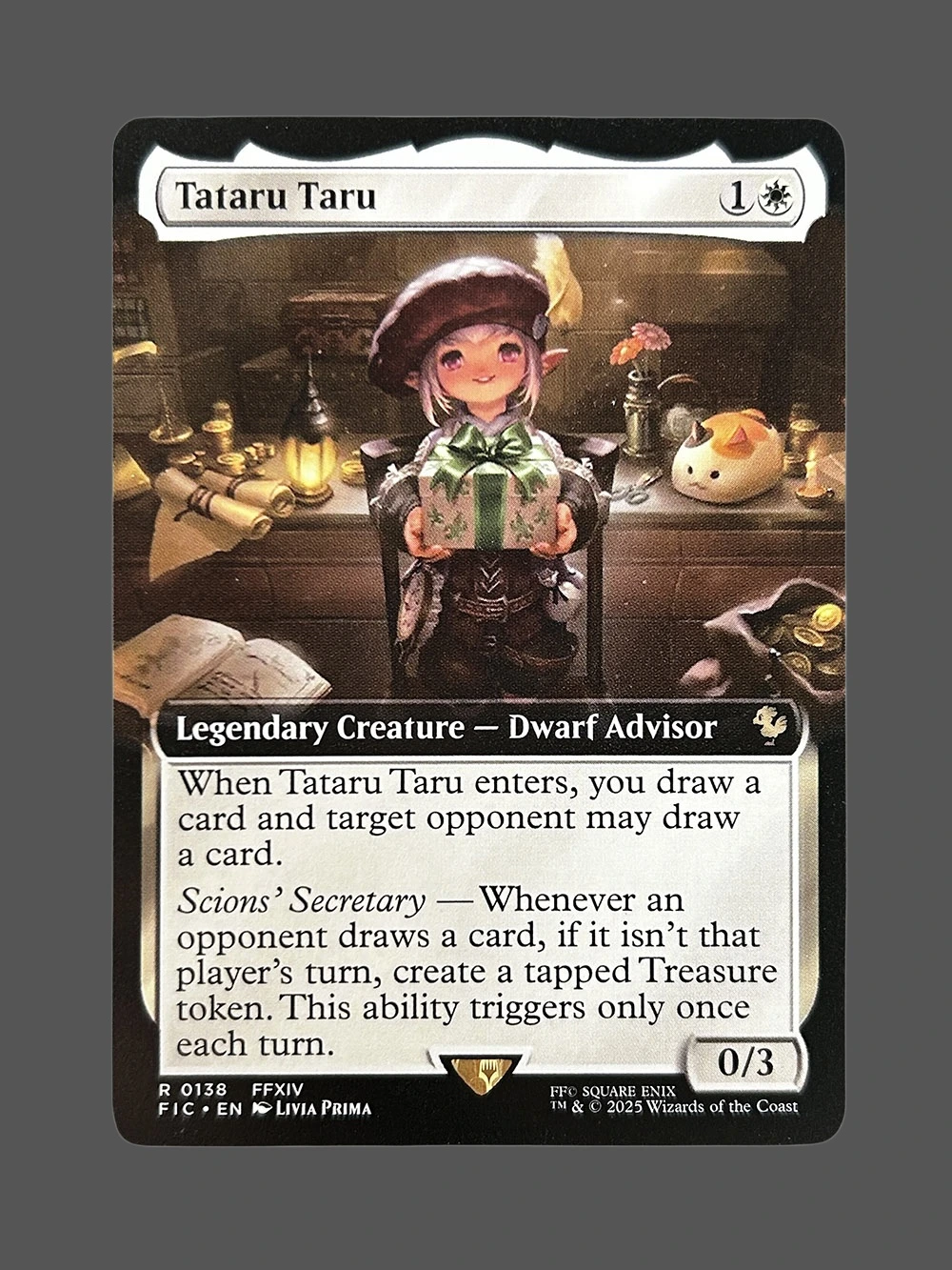 Looking for a high-quality Tataru Taru proxy? This Holo proxy from Final Fantasy: Champions of the Realm (FIC) is a Legendary Creature — Dwarf Advisor that draws a card when it enters the battlefield and creates Treasure tokens when opponents draw cards. Built with German black core paper and professional CMYK printing, it’s virtually indistinguishable from the original.