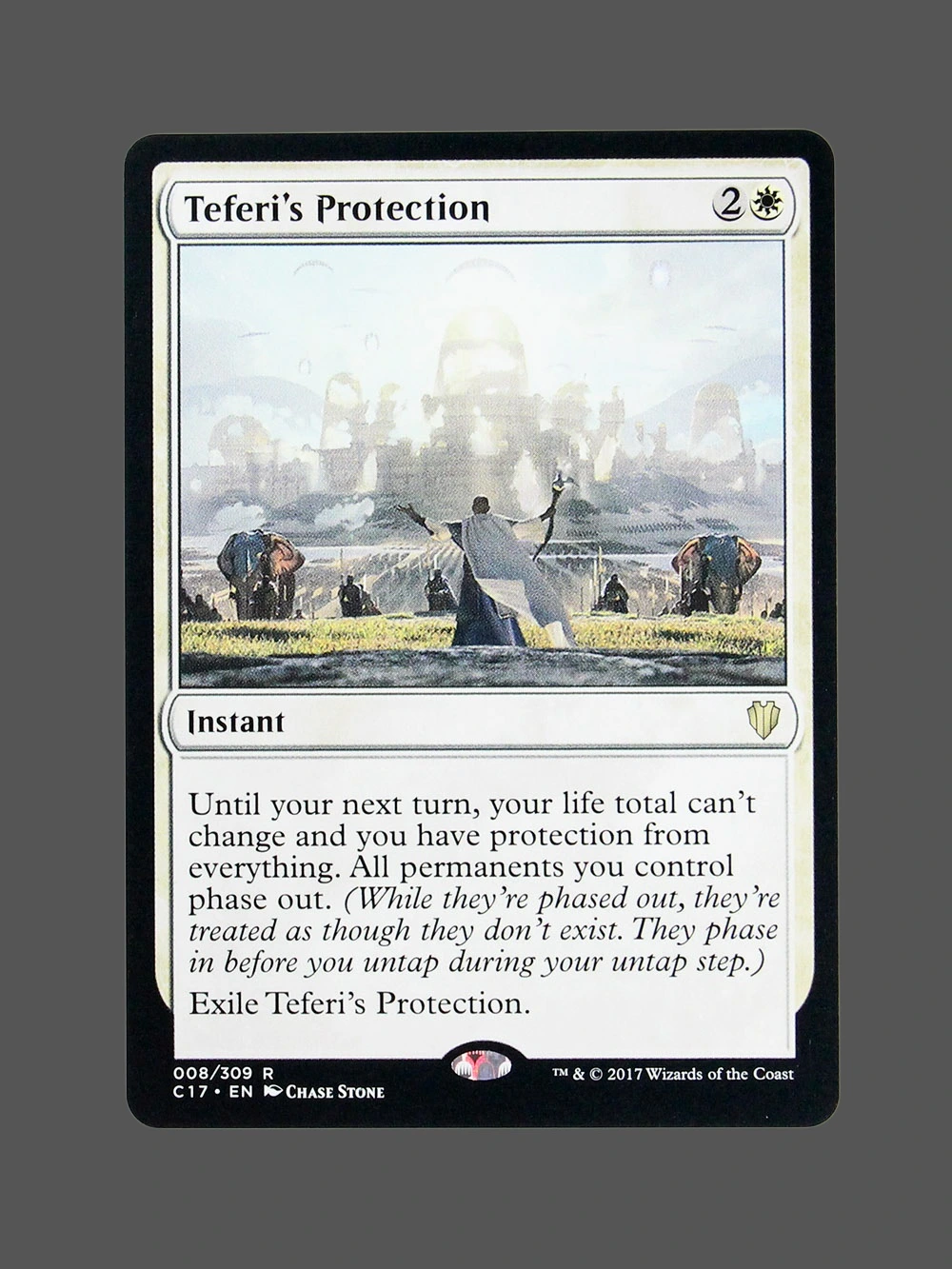 Buy Teferi’s Protection Holo MTG proxy from Core Set 2017. Premium cardstock, professional CMYK printing. Perfect for deck testing.