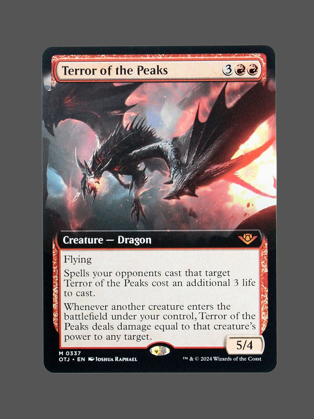 Looking for a high-quality Terror of the Peaks proxy? This Holo proxy from Outlaws of Thunder Junction (OTJ) is a Creature — Dragon that provides powerful board control with its ability to increase opponents’ spell costs and deal damage based on creature power. Built with German black core paper and professional CMYK printing, it’s virtually indistinguishable from the original.