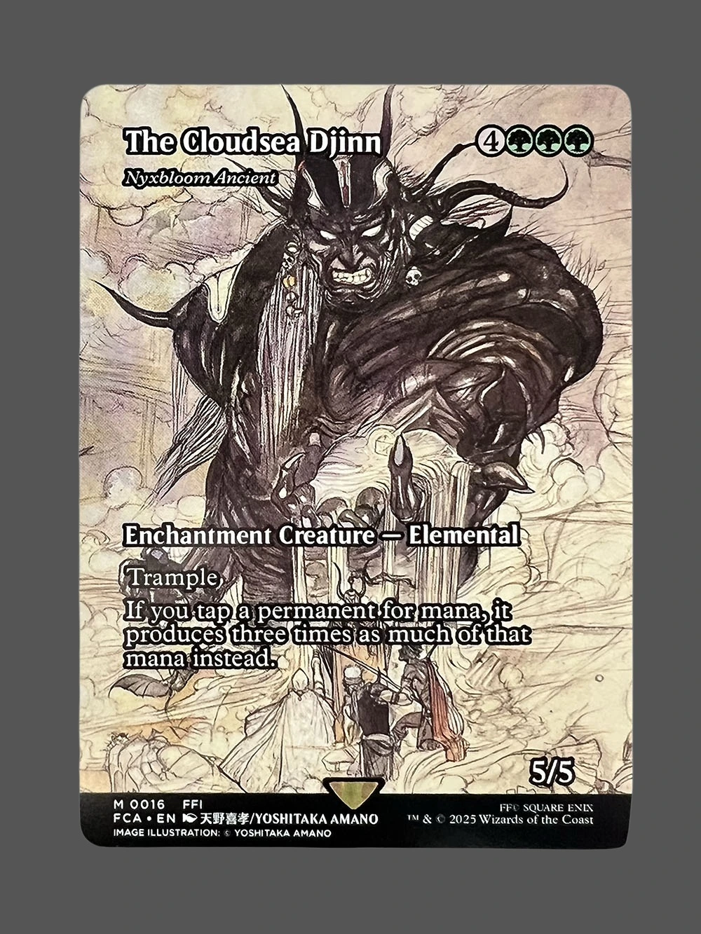 Looking for a high-quality The Cloudsea Djinn proxy? This Holo proxy from Nyxbloom Ancient (FCA) is an Enchantment Creature — Elemental that produces triple mana when tapping permanents. Built with German black core paper and professional CMYK printing, it’s virtually indistinguishable from the original.