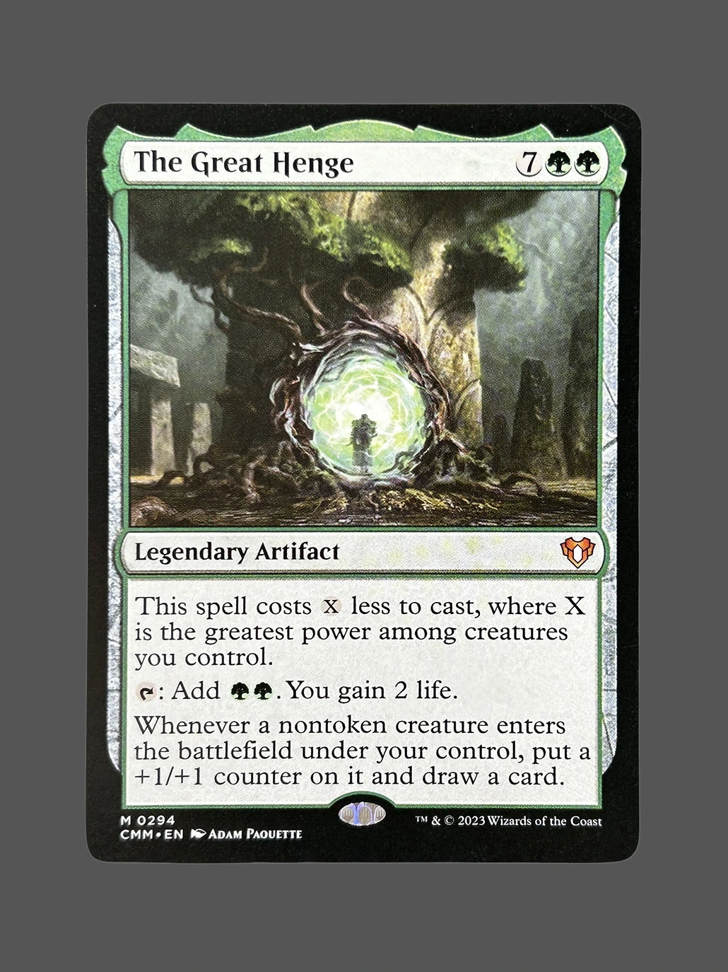 Looking for a high-quality The Great Henge proxy? This Holo proxy from Commander Masters (CMM) is a Legendary Artifact that reduces its casting cost based on the power of your creatures, provides green mana and life gain, and rewards you with +1/+1 counters and card draw when non-token creatures enter the battlefield. Built with German black core paper and professional CMYK printing, it’s virtually indistinguishable from the original.