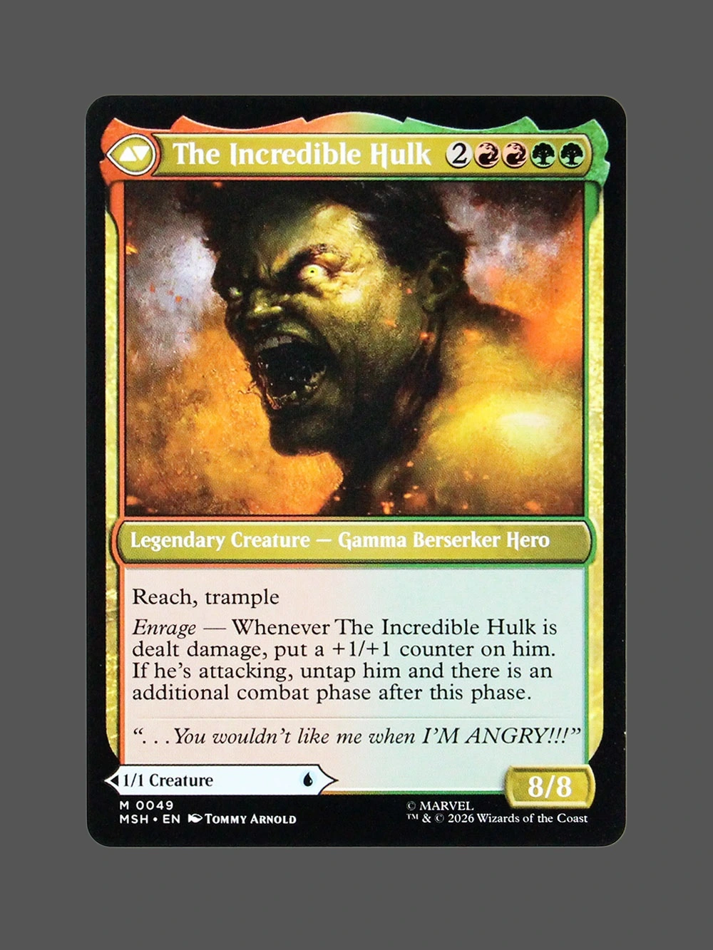 Buy The Incredible Hulk Holo MTG proxy from Marvel Snap. Premium cardstock, professional CMYK printing. Perfect for deck testing.