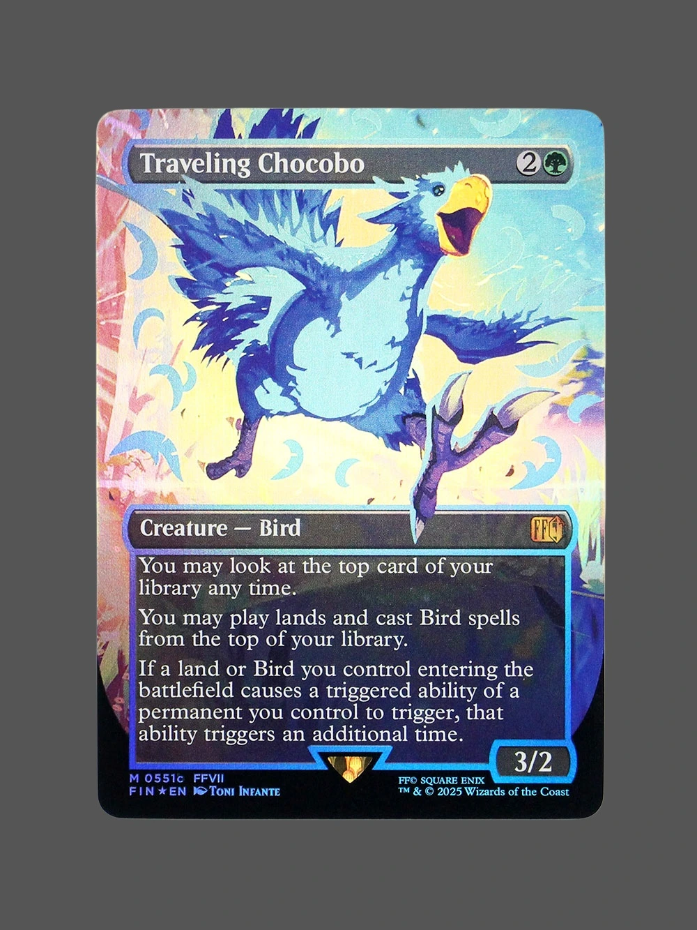Looking for a high-quality Traveling Chocobo proxy? This Foil proxy from Final Fantasy (FFC) is a Creature — Bird that allows you to look at the top card of your library, play lands and cast Bird spells from the top, and trigger abilities an extra time when lands or Birds enter the battlefield. Built with German black core paper and professional CMYK printing, it’s virtually indistinguishable from the original.