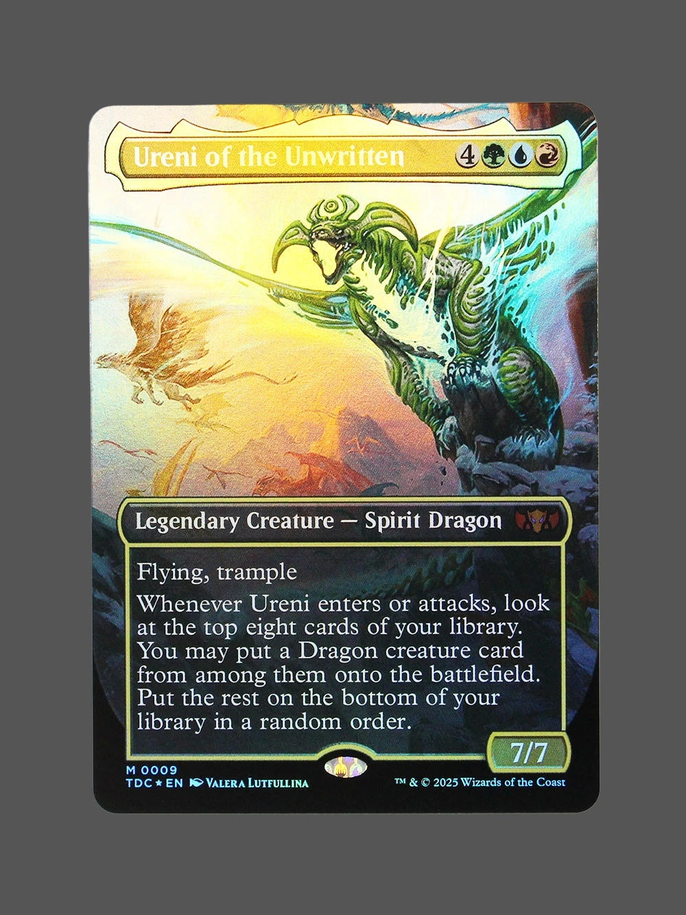 Looking for a high-quality Ureni of the Unwritten proxy? This Foil proxy from The Lost Caverns of Ixalan (TDC) is a Legendary Creature — Spirit Dragon that enters the battlefield with powerful abilities. Whenever it enters or attacks, you can search your library for a Dragon creature card and put it onto the battlefield, making it a key card in any Dragon deck. Built with German black core paper and professional CMYK printing, it’s virtually indistinguishable from the original.