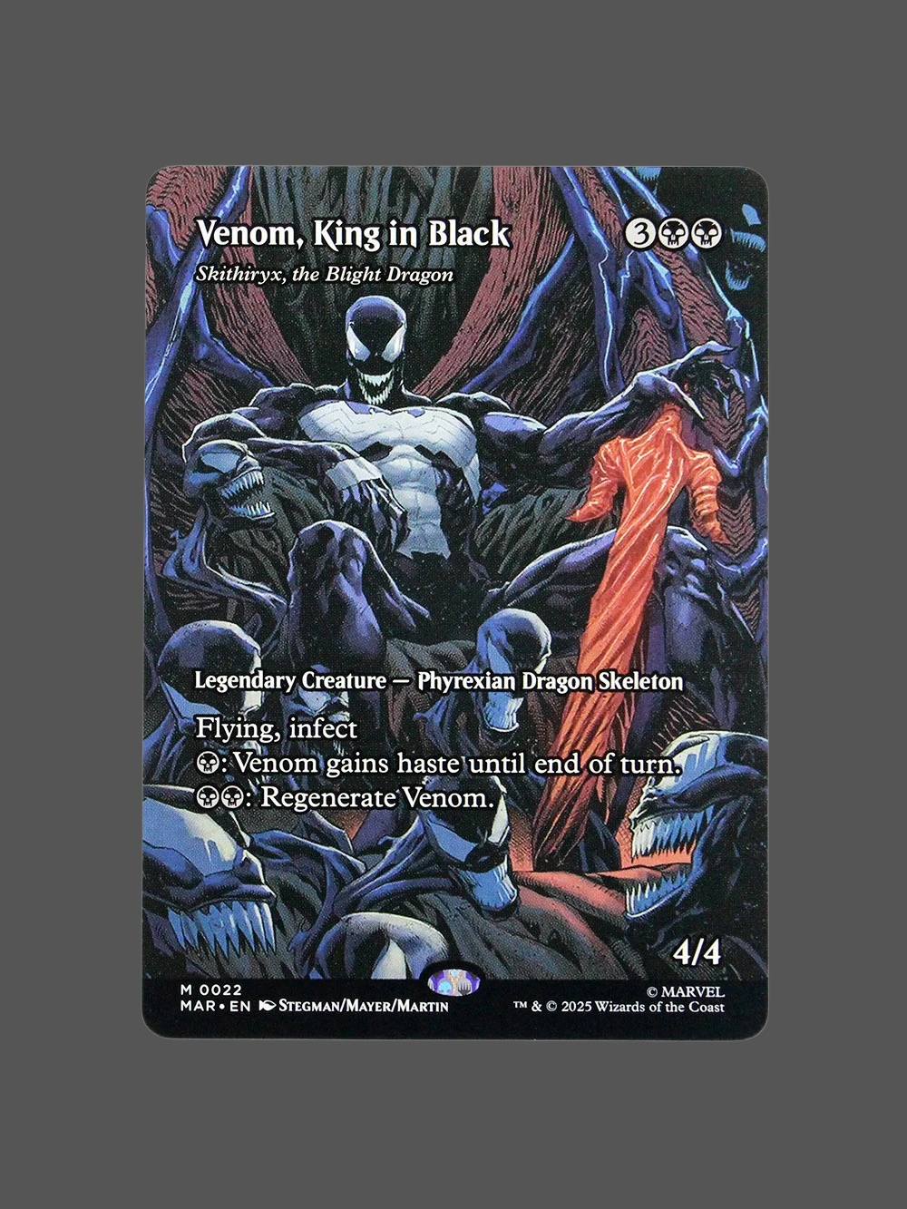 Looking for a high-quality Venom, King in Black proxy? This Holo proxy from the Marvel set (M) is a Legendary Creature — Phyrexian Dragon Skeleton that combines the power of Venom with Phyrexian mechanics. With flying, infect, and powerful abilities like haste and regeneration, this card is a standout in any deck. Built with German black core paper and professional CMYK printing, it’s virtually indistinguishable from the original.